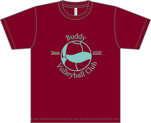 バーガンディの濃い色味のTシャツに、ミントグリーンのインク、赤系×緑系の反対色の組み合わせはバレーボールのデザインがはっきり目立っていい感じです!