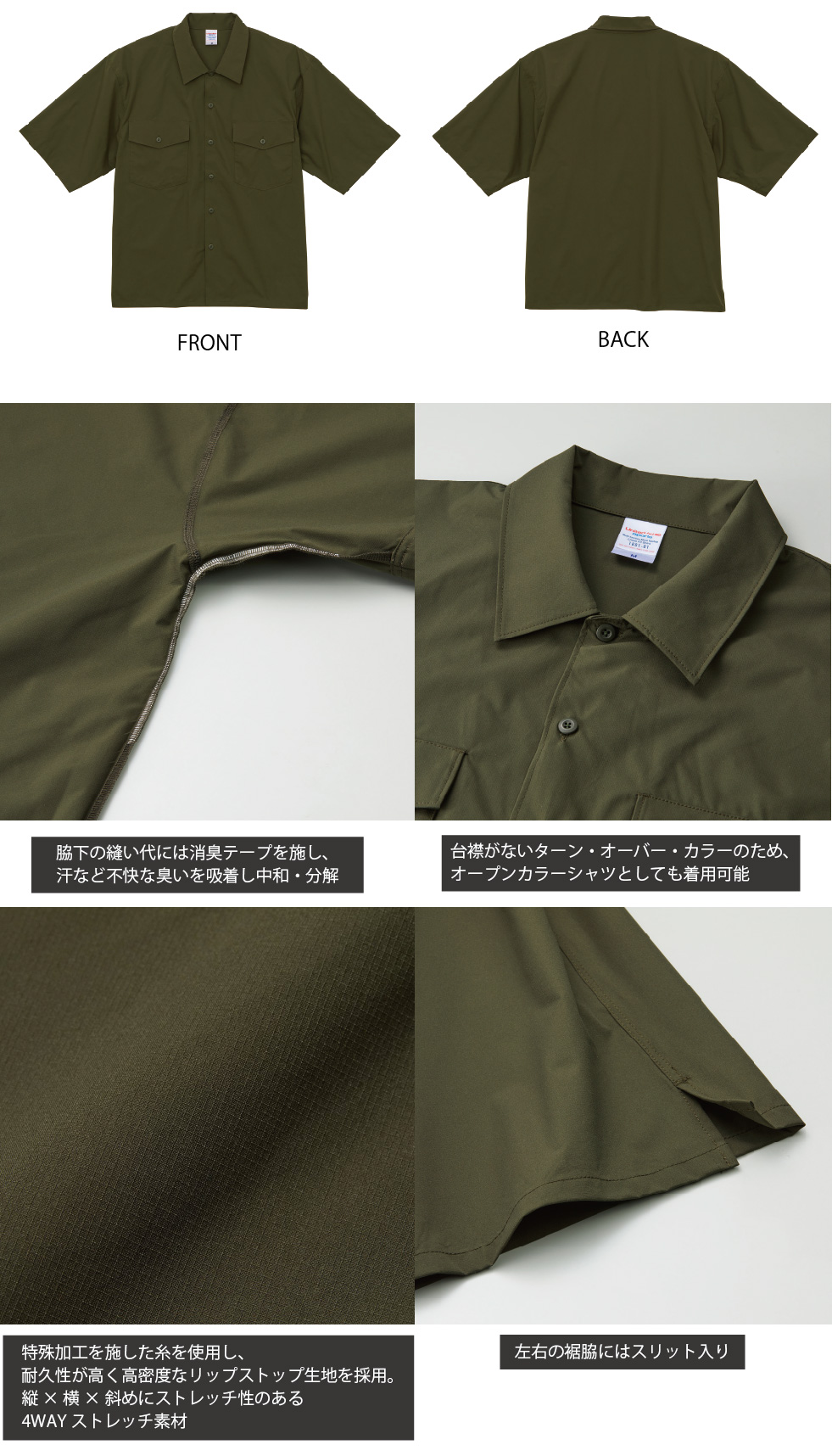 ストレッチ機能をもったウーブンテキスタイルのニュータイプショートスリーブシャツ。トレンドのオーバーサイズとバランスを考慮したポケットが魅力のニュータイプシャツになります。縦×横×斜めにストレッチ性のある4WAYストレッチの素材は着用時にストレスを軽減し、アクティブなシーンにも大活躍。ポリエステル素材なので洗濯後のケアを短縮できるのもうれしいポイントです。第一ボタンを外すとスタイリッシュでシティユースなオープカラーシャツに様変わり。この夏のコーデを格上げするアイテムです。