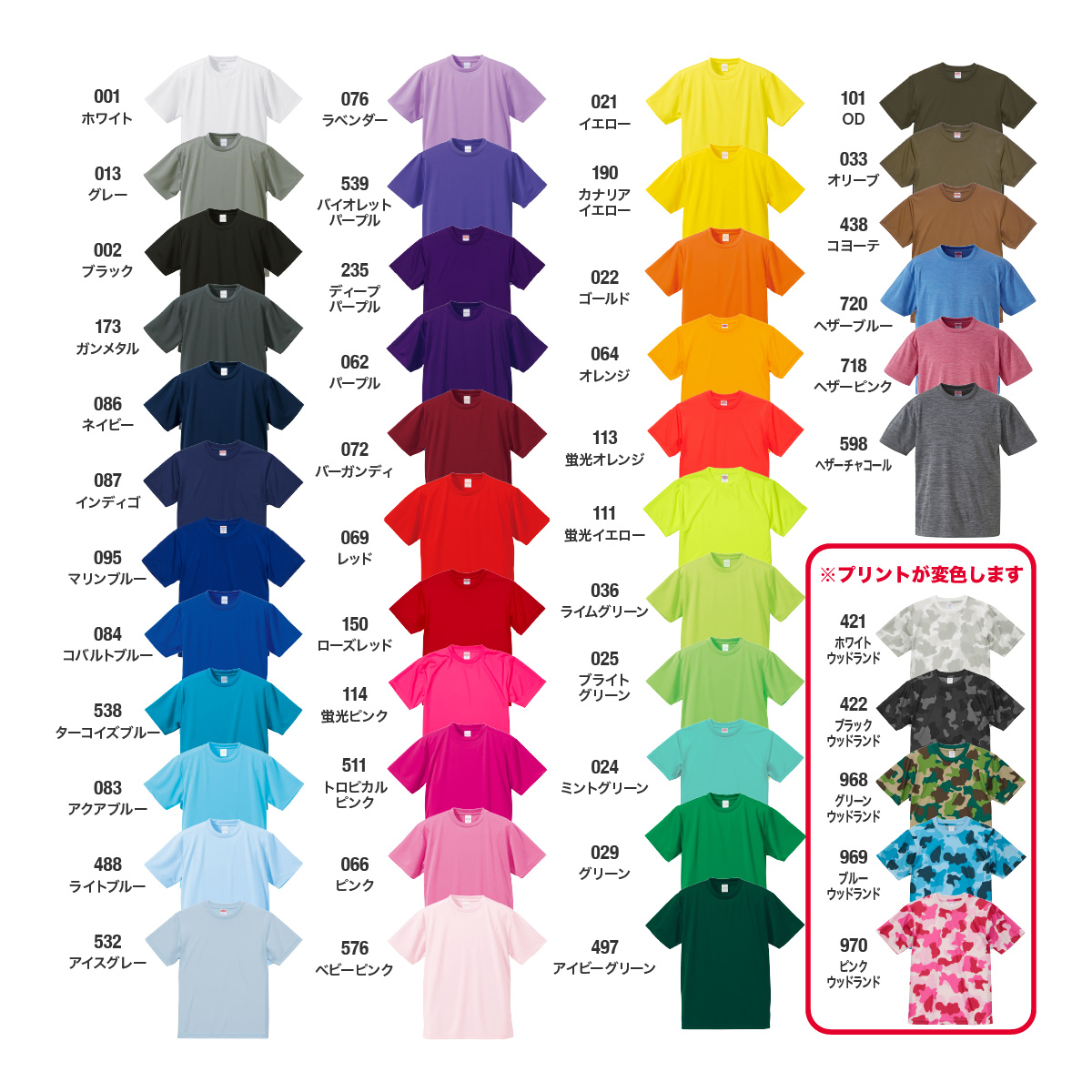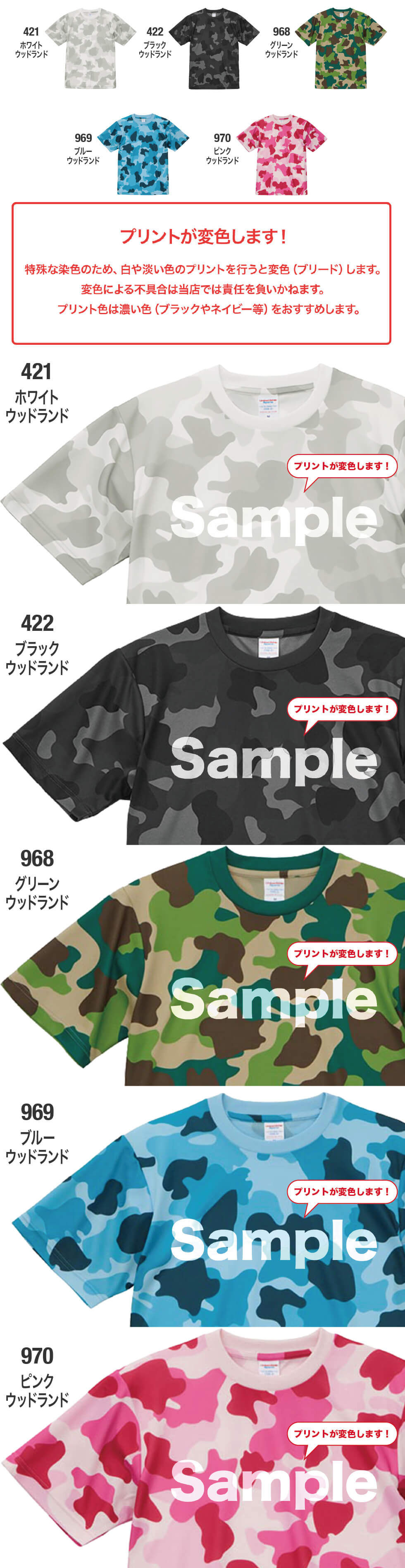 | 迷彩柄の変色について | ※特殊な染色のため、白や淡い色のプリントを行うと変色(ブリード)します。 変色には個体差があります。 変色による不具合は当店では責任を負いかねます。 プリント色は濃い色(ブラックやネイビー等)をおすすめします。 ※迷彩柄の見え方には、個体差が生じます。 |
